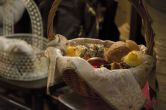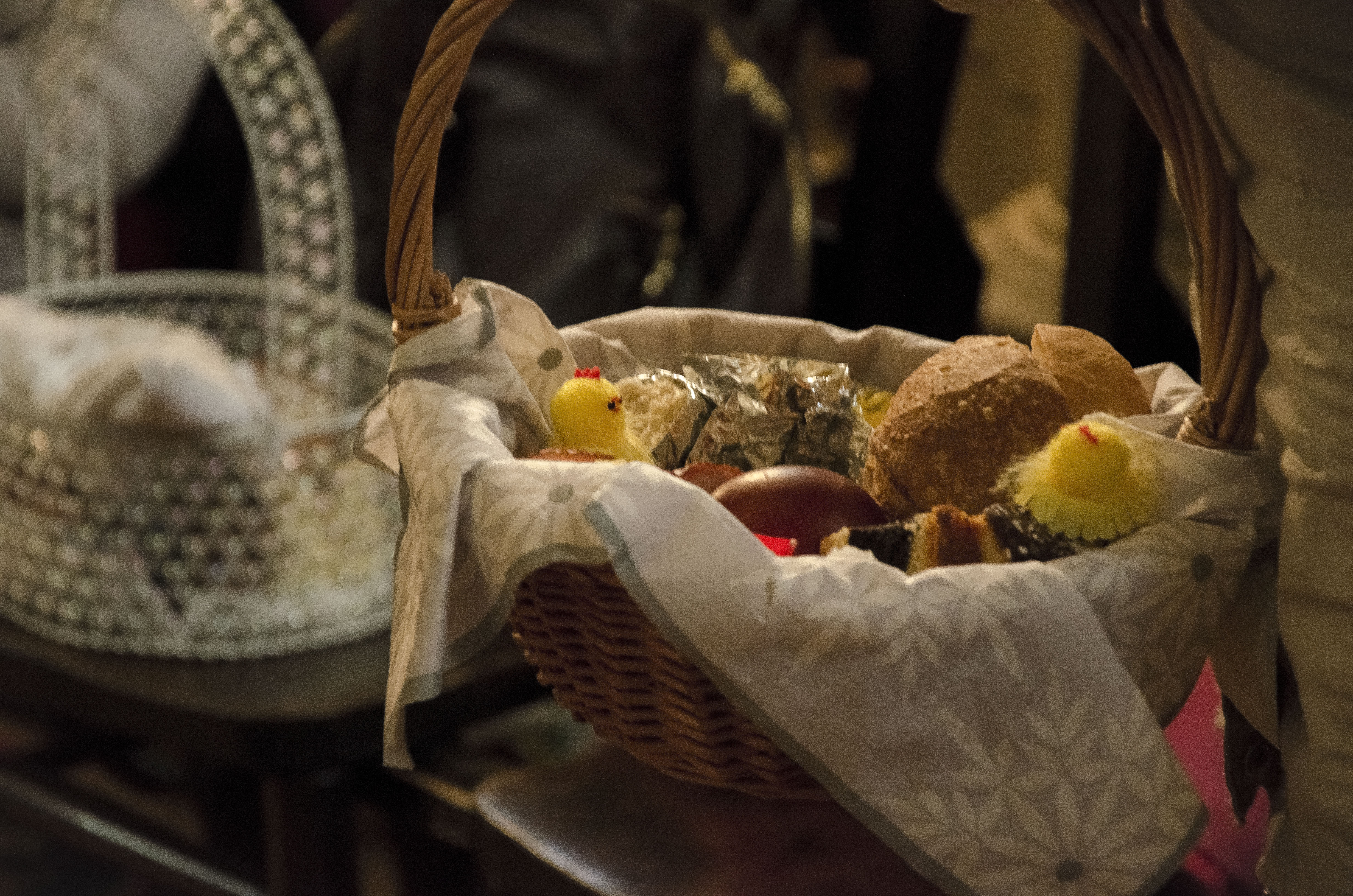 koszyczki ze święconką, a w nich jajka, baranki, chleb, sól,